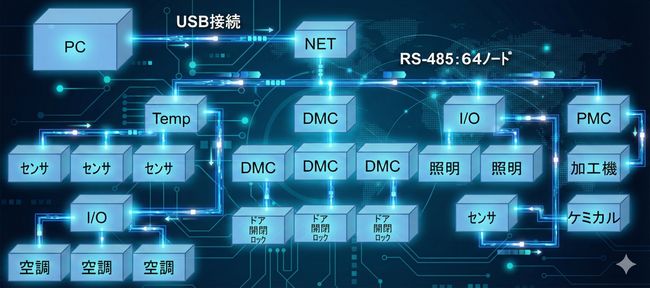 EZ-NETシステムは各種センサー、コントローラーを複数同時制御するシステムで、 ホストユニットはPCとUSB接続されて1ユニットあたり最大64台のノードを制御します。PCのUSBに複数のホストユニットを接続でき、一般的に4台のホストユニットを接続。トータルで255台のノードを同時制御します。 要素技術応用