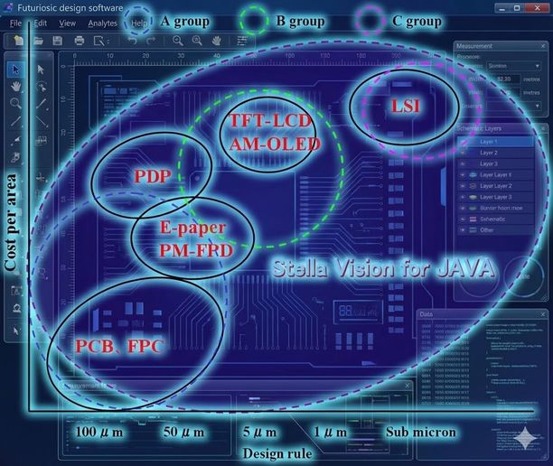 Figure shows relationship of design rule and cost per area, field of CAD/CAM system in main electronics device. For example, softwares of A group support PCB only, softwares of B group support AM-LCD and AM-OLED only, softwares of C group support semiconductor only. In short, supported range of these softwares is limited.