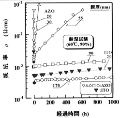 具体的には、@基板面内における抵抗率分布、A耐湿性、の2点である。@については、一般的にターゲットのエロージョン領域に対向するエリアの抵抗が上昇する。これは、エロージョンから高エネルギーの酸素が対向ポイントに衝突しO2リッチになるためであり、酸素の活性度を抑制するため高周波重畳スパッタ法を適用することにした。13.56MHzの高周波を印加するとともに、Arにガス加えH2ガスをチャンバ内にドープする仕組みで、この結果、基板温度200℃という低温成膜でも図3のように抵抗率分布を改善することができた。この際の比抵抗は7×10-4Ω・cmである。 一方、Aに関してはとくに膜厚50nm以下という薄膜で問題となる。図4は60℃、90%RHで耐湿試験を行った際の抵抗率変動で、ITOはほぼ抵抗率が変化しないのに対し、AZOは膜厚に大きく依存し、薄膜になるほど抵抗率が上昇する。実際、こうした耐湿環境下では膜のキャリア密度、ホール移動度とも低下する。これは、O2などが粒界に吸着するためと考えられる。そこで、第3の不純物としてV(バナジウム)をドープすることにしたた。この結果、膜厚50nmでも上記の環境下で1000時間後も抵抗率がほとんど上昇せず、膜厚20nmでも抵抗率の上昇が抑制された。もちろん、基本的な抵抗率と透過性はVドープレスAZOとほぼ同等である。このため、LCD量産プロセスへ適用する環境はほぼ整ったとしている。 フルプリンタブル有機TFTで電子ペーパーをドライブ