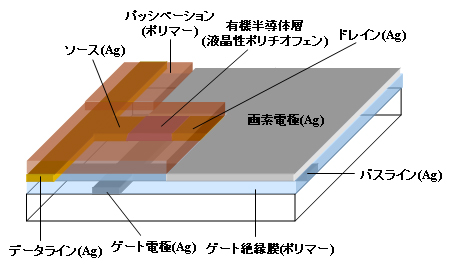 作製した有機トランジスタはボトムゲート・ボトムコンタクト型(図1)で、まずナノサイズAg分散液を塗布しフォトエッチング法でパターニングしてゲート電極とバスラインを形成。続いて、感光性ポリマーを塗布しフォトリソでパターニングしてゲート絶縁膜を形成する。膜厚は1μmで、Ra=0.6nmという表面平滑性が得られた。 続いて、ゲート絶縁膜を表面改質するとともにソース/ドレイン電極のパターニング精度を高めるため、SAM(Self Assembled Monolayer)材料を成膜しマスク露光によってパターニングする。この結果、SAMがある部分は表面エネルギーが低くなり撥水性に変化する。SAM材料としてフッ素化アルキルシランやOTS(オクタデシルトリクロロシラン)などを評価したところ、OTSでもっとも高いモビリティが得られた。ただし、OTSなどのSAMでゲート絶縁膜を表面改質すると表面エネルギーが低くなり撥水性となるため、上部に有機半導体溶液が塗布しずらいという難点がある。これについては、まだ明確なソリューションはみつかっていないという。 ゲート絶縁膜表面改質後はナノAgペーストをスクリーン印刷しソース/ドレインとデータラインを形成する。焼成後の膜厚は500nm、比抵抗は20μΩ・cmだった。チャネル長は50μmで、このレゾリューションでも十分QR-LPDをドライブできる。 この後、有機半導体層を形成する。用いたのは、膜状で自己整合的に配向する液晶性有機半導体。分子の配向によってキャリアを伝播するホッピングサイト同士が近くなり、モビリティが向上するためで、液晶性があるポリチオフェンをキシレンで溶解し、インクジェットプリンティング法でチャネル上に滴下した。膜厚は50nmである。 続いて、マル秘組成のポリマーをスクリーン印刷しパッシベーションを形成。最後に、ナノAgを薄膜で塗布・パターニングし画素電極を形成した。コンベンショナルなITOに代わってナノAgを用いたのはプリンタブル化するとともに、フレキシブル化が容易なため。もちろん、透明導電性ポリマーであるPEDOT/PSS(ポリエチレンジオキシチオフェン/ポリスチレンスルホン酸)を用いることも可能だ。