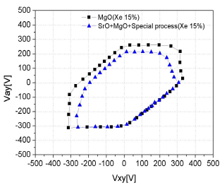 一方、Seoul National UniversityはSrO/MgOダブル保護膜パネルの特性を改善したことを報告した。研究グループは従来から2次電子放出特性が高く結果的に発光効率が向上するSrO/MgOダブル保護膜を提案してきたが、今回はアドレス放電遅れというSrO/MgOダブル保護膜パネル特有の問題を解消した。 実験では50型フルHD解像度に相当する7.5型パネルを作製し、コンベンショナルなMgO保護膜パネルとSrO/MgOダブル保護膜パネルの特性を評価した。MgOパネルのMgO膜厚は700nm、SrO/MgOダブル保護膜パネルの膜厚はSrO膜が600nm、MgO膜が100nmである。放電ガスにはNe-Xe15%を用い圧力400torrで封入した。 図8はしきい値電圧を比較したもので、SrO/MgOパネルはMgOパネルに比べ低電圧化できることがわかる。しかし、低電圧化は前記のようにアドレス放電遅れの増大を引き起こす。そこで、新たなリセット波形を用いた駆動法を採用。図9のように放電遅れをMgOパネル並みに低減した。
