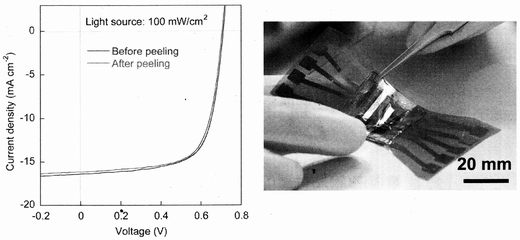 試作デバイスの構造・製造プロセスは図1の通りで、サポート基板であるガラス基板上に素子を作製した後、剥離層であるフッ素ポリマー層からリリースすることにより超薄型フレキシブルデバイスにする。つまり、簡易CVD法で成膜した薄膜ポリパラキシリレン(膜厚1μm)をサブストレートに用いる。図2はサポートガラスからの剥離試験結果で、光電変換効率は剥離前の8%から7.9%とほとんど低下せず、剥離によって素子が劣化しないことが確認できた。一方、大気中安定性は図3のように30日後も太陽電池特性を維持。ただし、剥離前に比べると経時変化は大きかった。