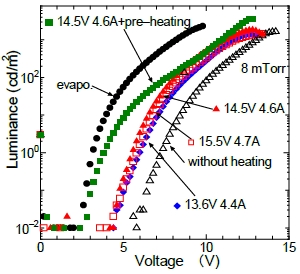 今回の研究では、ガラス基板上にITOアノード(70nm)/ITOバッファ層(0.6nm)/NPBホール輸送層(40nm)/Alq3発光層兼電子輸送層(30nm)/BCPホール素子層(30nm)/LiFバッファ層(0.6nm)/Alカソード(40nm)という構成の素子を作製。電極膜の成膜にはローダメージ法として知られる対向ターゲット式スパッタリング装置を用いた。そして、上部Al膜はスパッタ装置内に配置したヒーター(ハロゲンランプ、カンタル線ヒーター)によって赤外線を照射しながら成膜した。 図2に、ハロゲンランプで赤外線を照射しながら上部Al膜を成膜した素子の発光特性を示す。図中に示した電圧、電流はハロゲンランプに加えた電圧・電流である。Al膜が堆積すると赤外線反射が起こるために基板裏面に貼ったサーモプレートの温度は43℃以下に保たれているものの、赤外線照射を最適化することにより、発光開始電圧がコンベンショナルな蒸着素子と同等になることがわかる。また、図3から赤外線照射条件に依存して電流-発光特性が変化し、最適化すると上部Al電極を蒸着法で成膜した素子よりも良好な特性が得られた。 IGZOの表面を露出させずにアニールするとTFT特性・信頼性とも向上