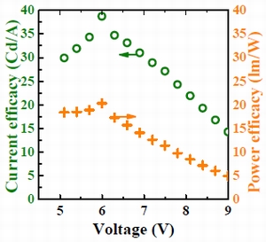 実験では、ITOアノード/PEDOT:PSSホール注入層/PVK+CTF:Ir(ppy)3緑色燐光発光層/BCPホール阻止層(10nm)/Caバッファ層(50nm)/Alカソード(100nm)素子を作製。発光層はドーパント濃度を4wt%に固定する一方、CTFのドープ比を0〜50wt%にした。 その発光特性だが、表1のようにCTFの濃度を0wt%から50wt%に増やすとキャリア注入特性が改善され、発光開始電圧が10.4Vから8.2Vに低下した。この構成の素子は元来、ホールの注入エネルギー障壁が0.8eV、電子の注入エネルギー障壁が1.0eVと比較的高いにも関わらず、CTFのドープによって特性が劇的に改善されたわけである。ベストリザルトはCTFを20wt%ドープした場合で、最高輝度は4505cd/m2、効率は9.9cd/Aに達した。これは、通常のCTFレスPVK素子(3553cd/m2、5.6cd/A)に比べ大幅に高い。また、図7のようにこのドープ比で最高効率は電圧12.6Vで得られた。 一方、CTFの濃度をさらに増やすと特性が低下した。これは、キャリアバランスが低下するか、もしくは膜が不均一になるためと考えられる。なお、いずれの濃度でも色度はx=0.32、y=0.61前後と変化せず、CTFのドープがすべての特性面で悪影響を与えないことが確認できた。 新たなホストとドーパントで世界最高クラスの高効率塗布型緑色燐光素子を 一方、台湾のIndustrial Technology Research Instituteは塗布型燐光素子向けとして新たなホスト材料と緑色ドーパント材料を開発。塗布型燐光素子で世界最高クラスの効率が得られたことを報告した。