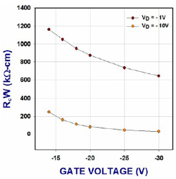 特性を評価したところ、キャリアモビリティは0.15cm2/V・sec、Vthは-3.4V、ON/OFF電流レシオは107だった。これらの値はリファレンスであるAuソース/ドレイン+蒸着ペンタセンデバイスとほぼ同じで、電子ペーパーをドライブするには十分なスペックといえる。 図31、32は半導体層とソース/ドレインの接触抵抗を測定した結果で、TIPSペンタセン半導体層とCNTソース/ドレインの接触抵抗はドレイン電圧−10V、ゲート電圧−20Vの場合8.5kΩ・cmだった。これに対し、リファレンスデバイスの接触抵抗は81.5kΩ・cmと10倍以上だった。前者の結果は、CNTの仕事関数が4.95〜5.05eVとTIPSペンタセンのHOMOレベルに近いため良好なコンダクタンスが実現するためである。これに対し、後者ではAuの仕事関数は4.8〜5.1eVであるにもかかわらず、Auとペンタセンの熱膨張係数が大きく異なるため、その界面が歪み、結果的に接触抵抗が増大するためと考えられる。 しかし、それでも10倍以上という差は既存の理論では説明できない。そこで、CNTはカーボンネットワーク構造により表面積が広いことも寄与していると推測している。写真29はCNTソース/ドレイン上の一部にTIPSペンタセンを塗布した様子で、TIPSペンタセンは3D構造であるCNTネットワークのブランク部に多く付着するとともに、CNT膜を平滑化しているように見える。これは、ソース/ドレインと半導体層の接触面積が増大していることを意味すると結論づけている。 IGZO-TFTはドライバ回路も基板上にビルトイン可能 一方、ここにきてフレキシブルディスプレイのアクティブ素子として急浮上している酸化物半導体では、半導体エネルギー研究所がアモルファスIGZO(In-Ga-ZnO)を用いてLCDをドライブしたことを報告した15)。IGZO-TFTでLCD、有機ELD、電子ペーパーといったFPDをドライブすること自体はWhat's NEWではないが、特筆されるのはドライバ回路をガラス基板上にビルトインしたことで、IGZO-TFTのさらなるアドバンテージを引き出したといえる。