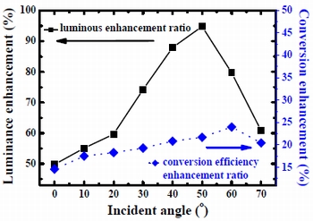 図8にタンデムデバイスの輝度向上レシオ・電力変換効率向上レシオと入射角の関係を示す。ナノピラーのAR特性のため、デバイス内部での反射がなくなり、輝度は49.8%も向上した。しかし、輝度向上レシオには入射角依存性があり、50度で94.8%というベストリザルトが得られた。他方、電力変換効率向上レシオは入射角に比例して増加し、マックスで24%だった。この際、変換効率はリファレンスの0.48%から0.55%と14.6%向上した。 透明有機ELと電子ペーパーを組み合わせてハイクオリティとローパワーを両立
