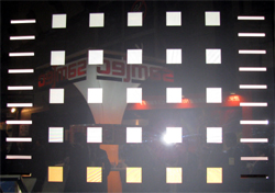 デバイス関連では、カネカが有機EL面光源でトピックスを提供した。展示したのは50×50oの青色、赤色、緑色、白色デバイスと180×180oの白色&青色デバイス。後者は大型のため、写真10のようにAl補助電極を設けて輝度均一性を確保した。アイテスの有機EL面光源事業を買収した成果で、すでに一般照明用としてサンプル出荷中。ただ、デバイス構造、そしてスペックも一切明らかにしなかったため、そのポテンシャルが高いかどうかはピンと来なかった。