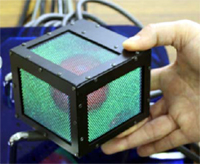情報通信研究機構(NICT)は、キューブ型の裸眼3Dディスプレイ「gCubik」を開発した。 図のように、キューブ状のgCubikの6面すべてに裸眼で観察可能な3D映像を表示し、「箱の中に立体映像が存在する」というコンセプトを具現化した。この結果、キューブの3面に3D画像を表示していた従来システムに比べ明るさを3倍、解像度を1.4倍に高めた。また、ディスプレイ部に極力制御基板などを配置しないことにより、1000×1000oクラスの3D画像表示でも手に持てるレベルにまで小型軽量化した。さらに、ディスプレイ部の表面にタッチパネル、内部に姿勢と加速度が計測できるセンサーやスピーカーを搭載。3D映像とのインタラクションができるようにした。 |