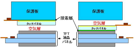 日立ディスプレイズは、保護板を独立させた携帯電話用タッチパネル付きIPSモードTFT-LCDを開発した。 従来のタッチパネル付きTFT-LCDでは、パネルから発するノイズの干渉を避けるとともにタッチパネルの感度向上のため、タッチパネルをTFT-LCDから離れた保護板側に接着する。この場合、携帯電話メーカーでの組立工程で保護板に傷や汚れなどの不具合が生じた際、保護板と接着したタッチパネルも合わせて交換する必要がある。 そこで、タッチパネルを保護板から分離し、保護板が独立した構造のタッチパネル付きパネルを開発したもの。駆動方法を工夫することによりパネルから発生するノイズを従来の半分以下に低減。保護板が独立しているため、保護板そのものの材質・色などのデザイン面での自由度も向上し、防水設計も容易になるという。 |
