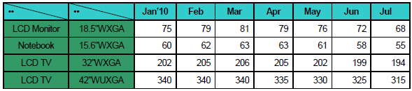 Displaybankの発表によると、7月の大型TFT-LCD(9型以上)価格はPC用パネル、テレビ用パネルとも前月に比べ下落した。 7月後半における価格は、モニター用18.5型ワイドXGAが前月比4ドル安の68ドル、ノートPC用15.6型ワイドXGAが3ドル安の55ドルに。また、テレビ用パネルの価格も下落し、32型ワイドXGAが前月比5ドル安の194ドル、42型ワイドUXGAも10ドル安の315ドルとなった。Displaybankでは8月も引き続きパネル価格が下落すると予測している。 |