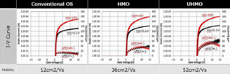 ジャパンディスプレイ 第6世代量産ラインで従来比4倍のモビリティを有する酸化物TFTを開発 ジャパンディスプレイは、茂原工場(千葉県茂原市)の第6世代量産ラインで従来に比べ大幅に高いキャリアモビリティを誇る酸化物TFT技術を開発したと発表した。開発したのはモビリティが従来の酸化物TFTに比べ2倍以上となる高移動度酸化物半導体(HMO、High Mobility Oxide)、そして4倍以上となる超高移動度酸化物半導体(UHMO、Ultra High Mobility Oxide)。UHMO技術では52cm2/Vsというハイモビリティを実現。この結果、オフリーク電流が低いという酸化物TFT技術の特徴を維持しながら、低温poly-Si TFT(LTPS)と同水準のON電流を流すことができる。