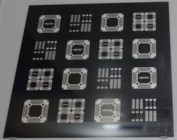 This means that even when printing droplets with a diameter of 20 ƒÊm into grooves 40 ƒÊm wide, 100% of the droplets land within the grooves. At the booth, samples printed by inkjet on glass and silicon wafers were displayed. Typical printed line-and-space resolution was L&S = 50 ƒÊm / 50 ƒÊm, demonstrating a 100% yield at this resolution. Fine Patterns Using Ag Sintered Metal for Glass Substrates