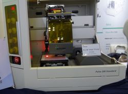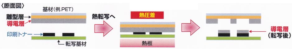 汎用デバイス向けマテリアルでは、マルアイの熱転写CNT透明導電ナノシートにオリジナリティを感じた。PETフィルム上に離型層をはさんでCNT(カーボンナノチューブ)透明導電膜を印刷したシートで、例えばトナータイプなら図3のように基材にトナーを印刷した後、このシートを熱圧着するとCNT導電層が上部に付着。この結果、絶縁性だったトナー部が導電性に変化する仕組み。つまり、印刷+熱転写という簡易プロセスで電極パターンが形成できる。もちろん、シート自体フレキシブル性があるため、容器などの曲面形状物に対する転写特性も備える。写真3は印刷したトナーにこのシートをラミネートして導電性を付与するデモ風景で、導電性が容易に得られる様子がイメージできた。