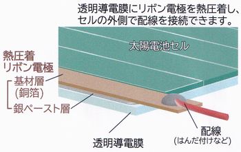 このリボン電極は圧延銅箔基材層にAgペースト層を積層したもので、リールタイプと短冊タイプを用意。図2のように、ペロブスカイト太陽電池セルの透明導電膜上に圧着し、セルの外側で配線接続する仕組み。100〜120℃×60〜120秒と低温かつ短時間で熱圧着することができ、PETフィルムのような低耐熱基板にも適用できる。前記のように、ACFを用いる場合と違い、FPCを使用する必要がなく、コスト的には圧倒的に有利といえる。原理上はTFT-LCDのようなディスプレイにも応用可能だが、ファインピッチが困難なため、当面の用途はペロブスカイト太陽電池に限られるようだ。 韓国メーカーがペロブスカイト太陽電池製造用IJプリンターを披露