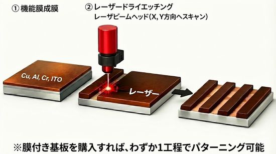 ◆レーザーダイレクトドライエッチング (L&S=2μm以下のファインパターニングが可能) ・R&D向けのファインパターニングに ・MEMSやMCMの生産に